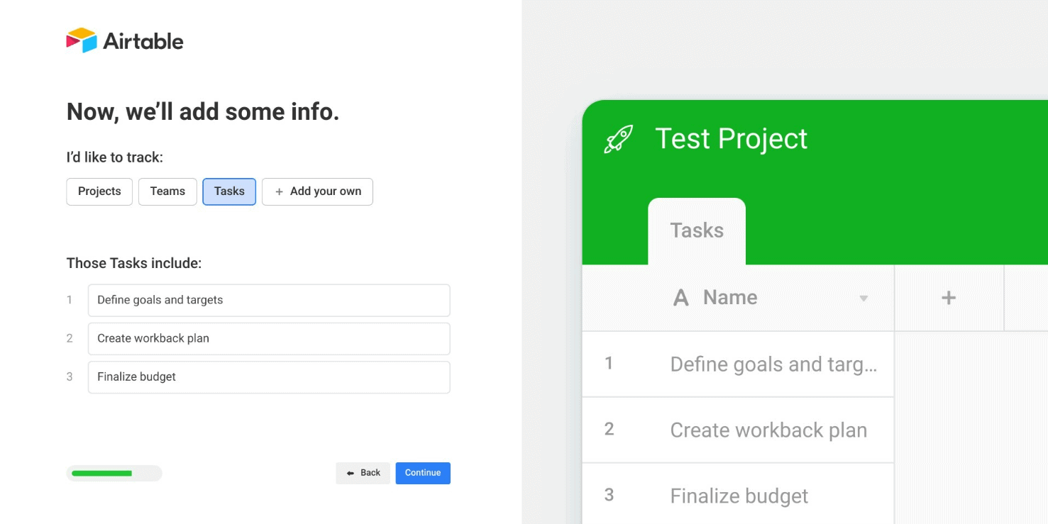 You’ll give Airtable some basic information (what kind of team you’re on, what you’d like to track, and so on) and then the dashboard will appear: